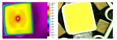 利用熱像儀,工程師可以所得到的光源半導(dǎo)體芯片發(fā)熱紅外熱圖,分析出其芯片在工作時的溫度,以及溫度的分布情況,在此基礎(chǔ),達(dá)到提高LED產(chǎn)品壽命的目的。