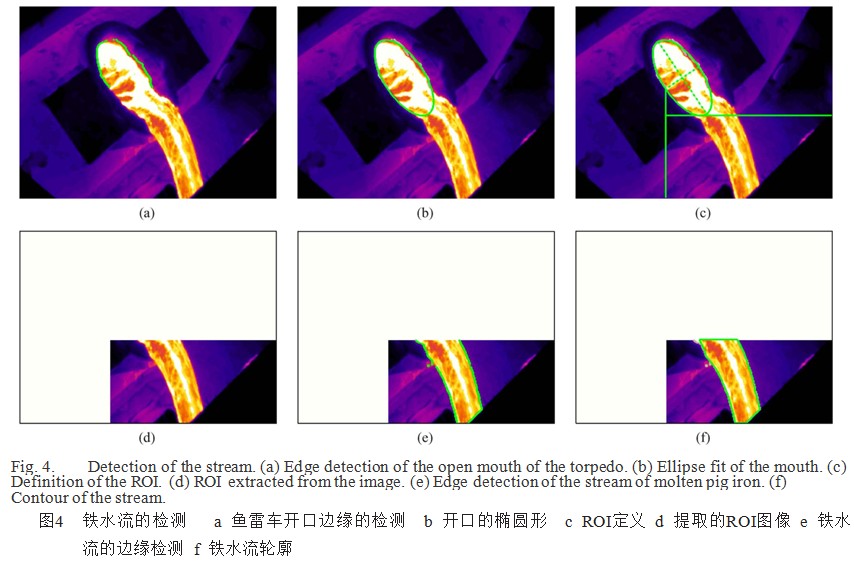 該測(cè)量方法是基于圖像的幾何特征的提取來(lái)檢測(cè)紅外圖像中的鐵水流。程序開(kāi)始于先檢測(cè)魚(yú)雷車(chē)開(kāi)口的位置,然后基于這一點(diǎn),計(jì)算鐵水流的整個(gè)輪廓。